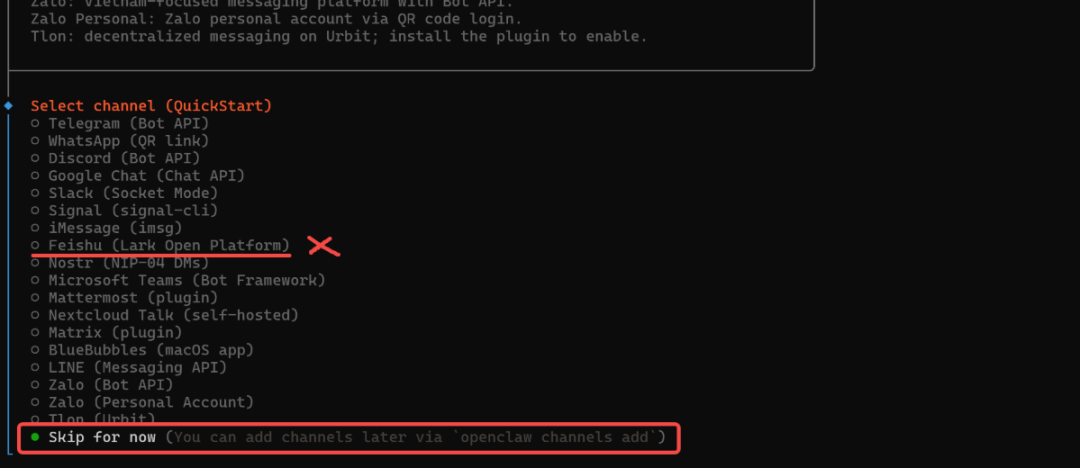 但是我建议先跳过,先测试是否可以跑通,再接入飞书,所以选择最后一个跳过
