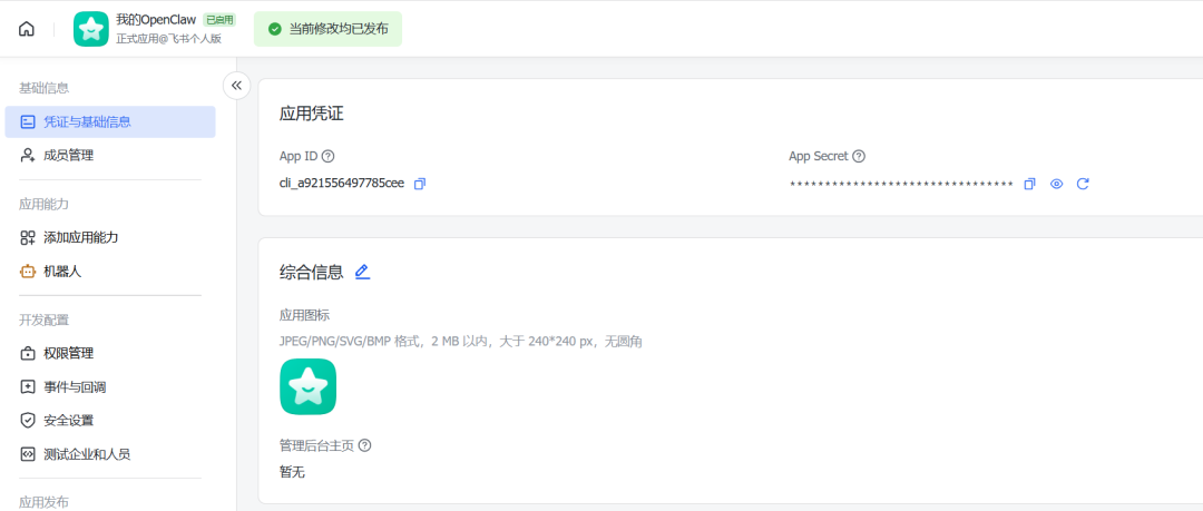 AppID,AppSecrect 在刚才飞书的凭证与基础信息上获取