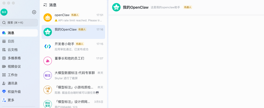 然后打开飞书软件同意审核,进行搜索 我的openClaw