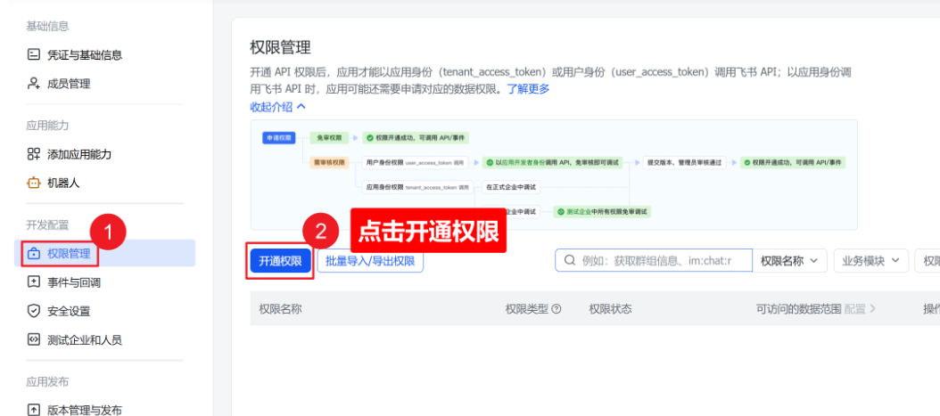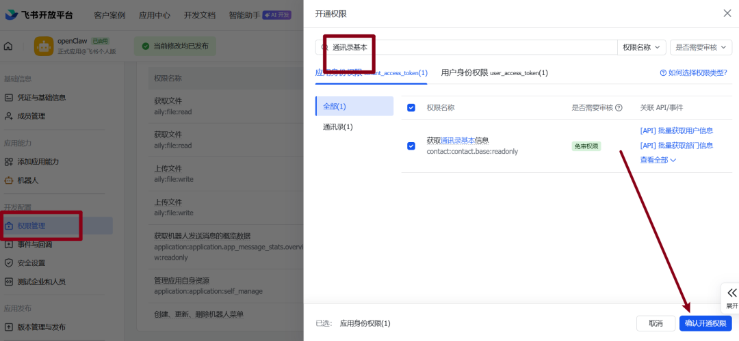在权限管理中,给应用开通获取通讯录基本信息的权限: