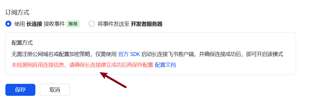 如果提示“没有建立长连接”,通常等 1~2 分钟再点保存就好