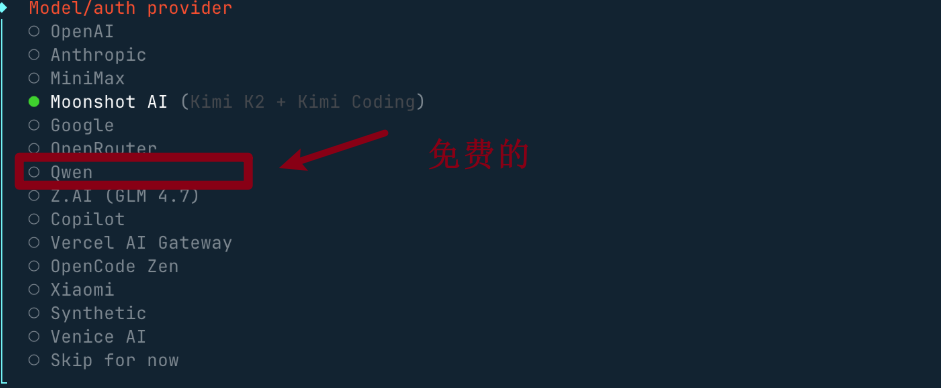 下一步就开始选模型,选择Qwen这个模型,可以快速登录不需要输入api秘钥,并且还免费使用