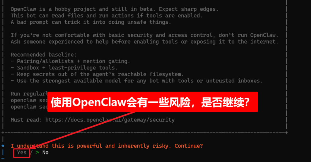配置的第一步就是告知你 ,使用OpenClaw可能会有一些风险。请问你是否继续?
